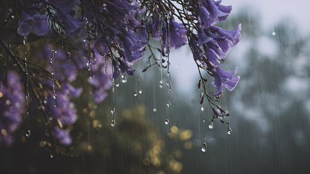 Soft rain falling gently on Jacaranda, with water droplets forming and slowly dripping. The background is softly blurred with a natural, moody atmosphere.