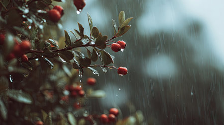 Soft rain falling gently on Mayhaw, with water droplets forming and slowly dripping. The background is softly blurred with a natural, moody atmosphere.