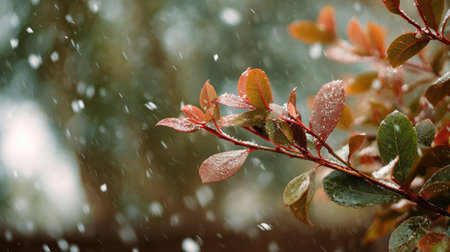 First snow falling gently, a few snowflakes drifting slowly and settling on the leaves; fresh air.