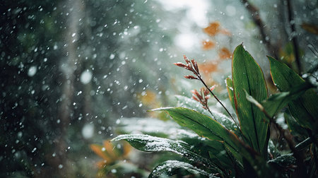 First snow falling gently on Rattan palm, a few snowflakes drifting slowly and settling on the leaves; fresh air.