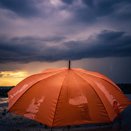 Rainy day with orange umbrella in the rain. Rainy weather.