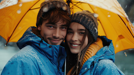 A beautiful young couple in blue raincoats stands under a large yellow umbrella.