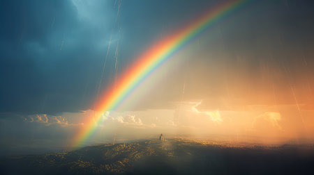A stunning view of a rainbow arching over mountains beneath a stormy sky. The landscape showcases nature's beauty, vibrant colors, and dramatic contrasts.