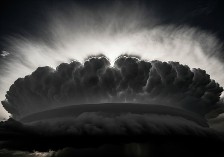 Meteorological showing a dramatic and ominous dark gray storm cloud formation looms in the sky, with swirling textures and heavy rain visible in the distance,...