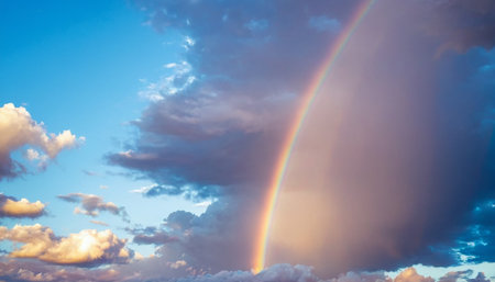 Dark storm clouds shift into a radiant rainbow against a backdrop of blue sky, symbolizing hope and transformation after a rainstorm.