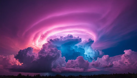 Meteorological showing dramatic dark storm clouds illuminated by bright lightning strikes across the sky keywords:...