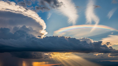 A dramatic sky heavy dark storm clouds with bright sunlight rays breaking through and a partial rainbow.