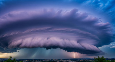 storm clouds brewing over cityscape with hail, lightning and wind, created with generative ai