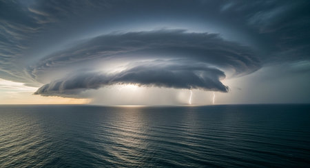 A powerful storm looms over a dark ocean, showcasing ominous clouds and heavy rain creating a dramatic and moody scene. Perfect for weather reports and disaster concepts.