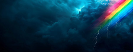 Pride LGBT background with a bold rainbow lightning bolt against a dark stormy sky, powerful and striking