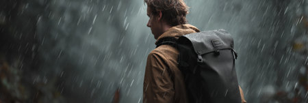 A courier braves the heavy rain while walking through a dense, green environment, confidently carrying a weatherproof backpack to stay dry and prepared