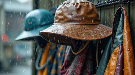 Rain-soaked leather and fabric hats hanging on a rack outdoors in drizzle. That the image is generated using AI.