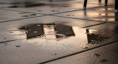 Rainwater forms puddles on a tiled outdoor patio surface, reflecting the surrounding architecture and warm evening light. The wet tiles and ripples create a mood of calm after a storm or a rainy day.