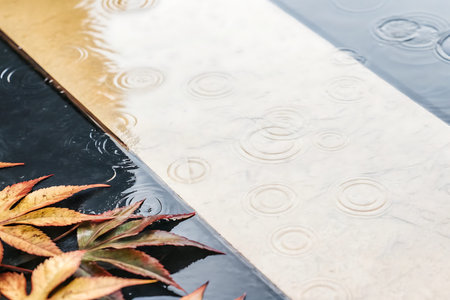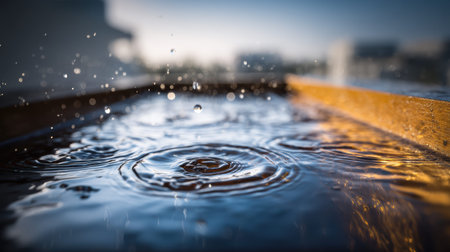 Captivating close-up of raindrops splashing against wet pavement, showcasing ripples and reflections in an urban environment, creating a serene atmosphere.