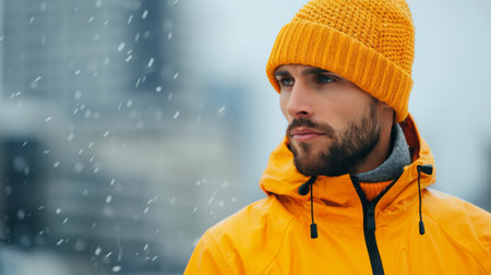 A man stands in a snowy forest, wearing a yellow jacket and beanie, gazing thoughtfully into the distance while snowflakes fall around him, capturing the serene beauty of winter.