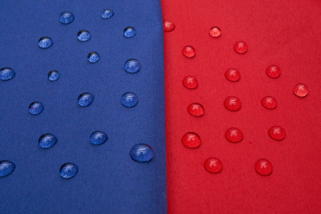 two examples of waterproof clothes. water dew drops on red and blue membrane fabric textile