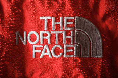 Zaragoza, Spain - October 21, 2021: Logo of the mountain sports brand, known as The North Face, sewn on a rain jacket.