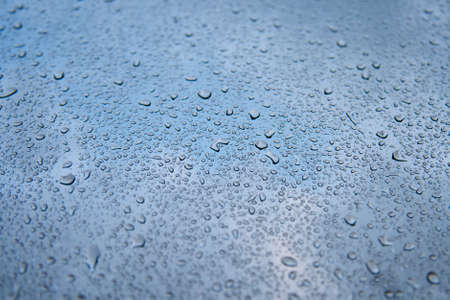 Water droplets on the metal surface in black color in close-up view, selective soft focus.