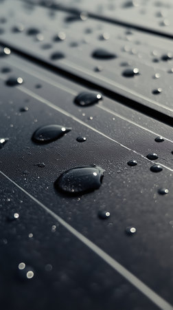 After rainfall, water droplets rest on the surface of a solar panel, showing the detailed texture of the panel and the beauty of the droplets as light reflects off them.