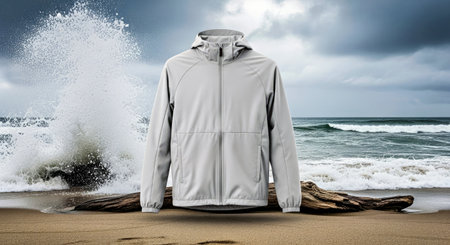 Photorealistic Blank Water-Resistant Running Jacket Mockup Stormy Coastal Beach Scene