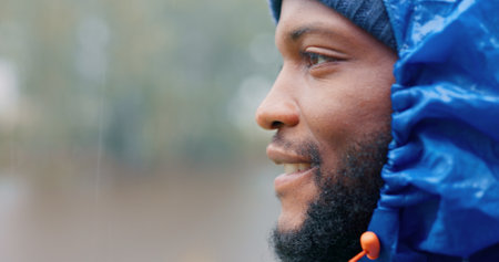 Heavy rain during autumn day. Portrait of young man in waterproof jacket.