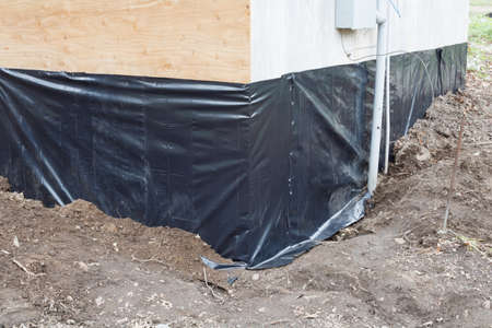 Black plastic being used to protect foundation from water damage