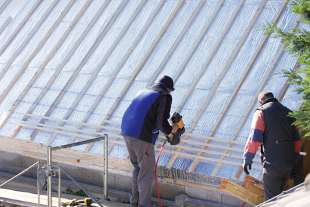 Insulation and waterproofing of the roof surface, the worker nails the film to the boards.2020