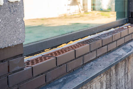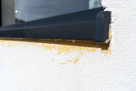 Yellow mounting foam filled under the window sill, white plaster is stained by sloppy work.