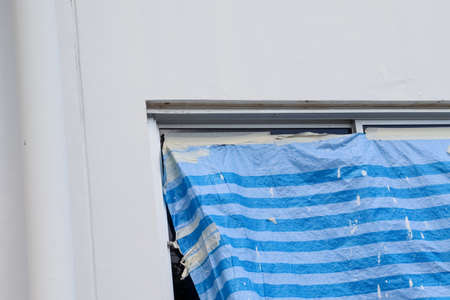 a man obstructs a window with a large piece of plywood before a natural disaster, a hurricane