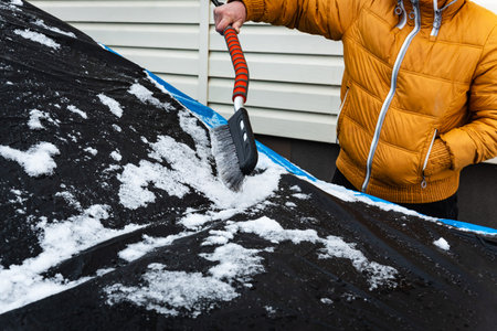 Clearing black car from snow using brush. Car is protected from weather by tarpaulin cover in winter