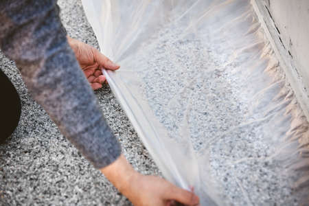 Waterproofing of the base of the building. Front on external insulation works. New Basement Foundation Waterproofing. Protective film on the facade of the building.
