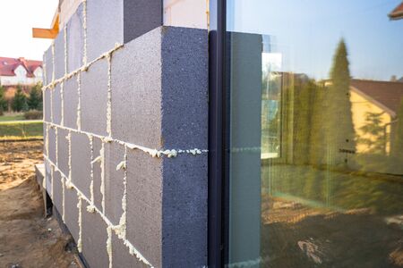Building and Construction site of new home. Exterior view of new house under construction. Mineral wool for insulated house.