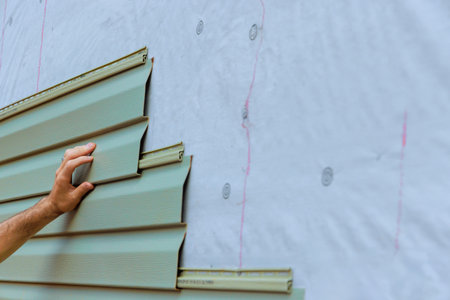 In process of installing vinyl siding on new home facade, handyman installs vinyl PVC siding