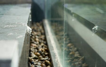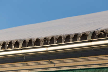 season, housing and winter concept - icicles hanging from building drainpipe