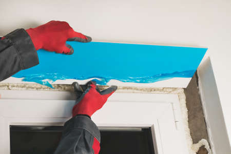 The master makes plastic slopes for windows from insulated panels of white color