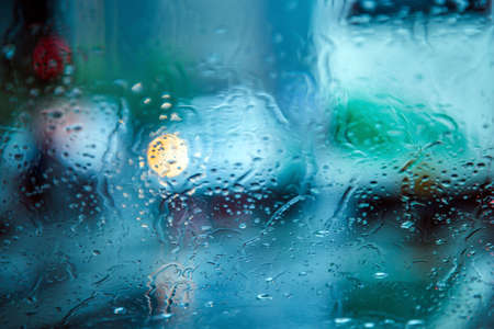 The rainy evening weather behind the window of the city.
