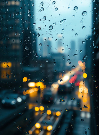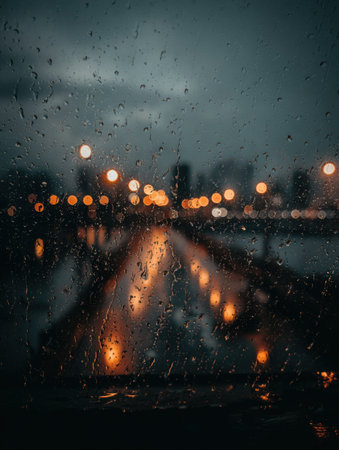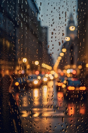 Raindrops clinging to a foggy window, blurring city lights in the background, evoking a nostalgic and contemplative atmosphere on a rainy evening.