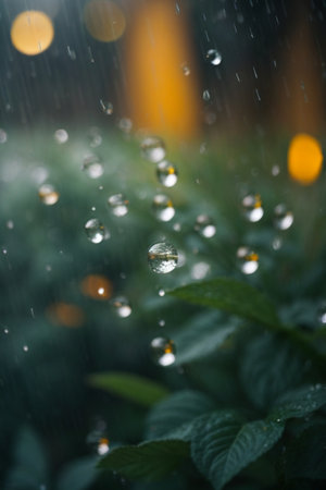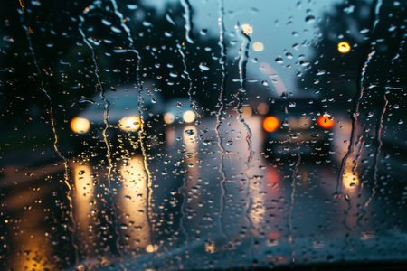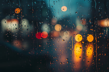 Rain drops cascade down a window against a backdrop of illuminated street lights, creating a contrasting scene of nature and urban elements.