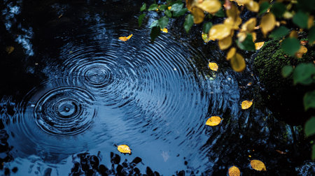 Soft rain drops creating ripples on blue water, forming expanding circles that convey a peaceful, tranquil mood perfect for nature photography.