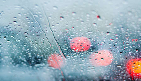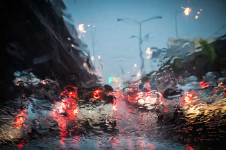 Drops Of Rain Drizzle on the glass windshield in the evening. street in the heavy rain. Bokeh Tail light. soft Focus. Please drive carefully, slippery road. soft focus.