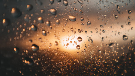 Captured close-up of raindrops on glass during a stunning sunset, showcasing an interplay of light and nature, creating a serene and calming atmosphere.