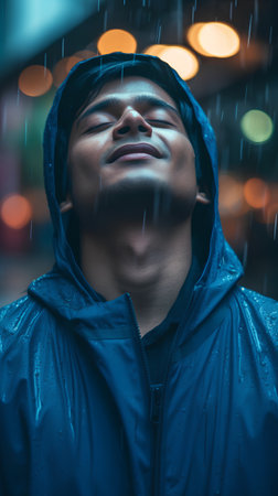 Man standing in the rain smiling freely, embracing nature and expressing peace, joy, and mindfulness during rainfall.