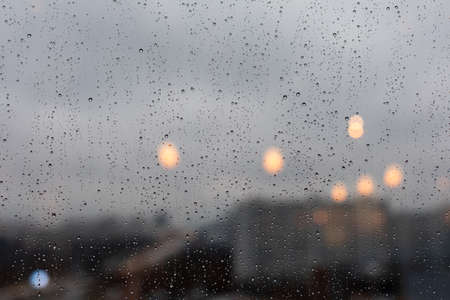 Rain drops on the glass with blurred city background and bokeh