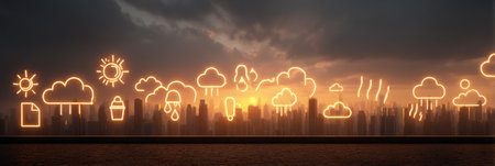 Bright weather icons light up the skyline featuring clouds, sun, and rain, set against a vibrant sunset and towering buildings, showcasing the city atmosphere.