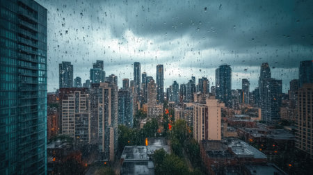 Rain droplets on a window with a blurred urban skyline in the background during a stormy evening