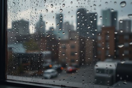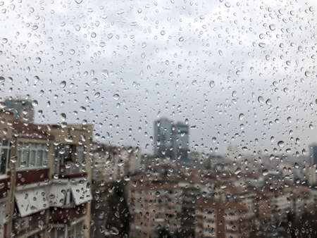 Rain drops on window glass with city view blurred background. Rainy weather concept