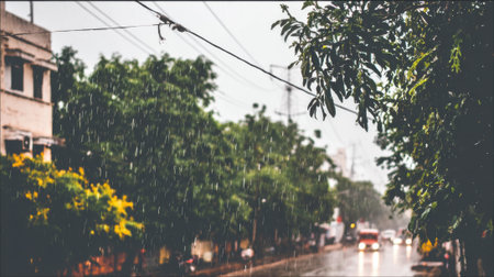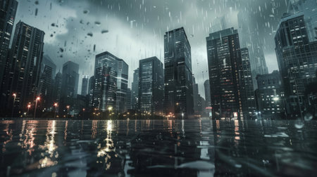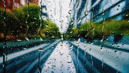 Rainy season cityscape, with raindrops glistening on the pavement and reflections in the water