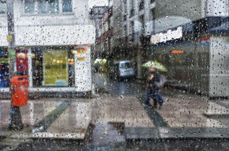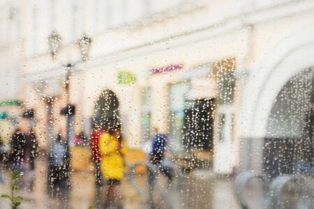 Abstract blurred silhouettes of people after rain in the city, girl in yellow seen through raindrops on window glass, blurred background. Concept of modern city.