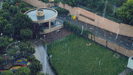 Cinematic shots in the slow motion of a heavy rain in the city, an overhead view of the backyard of a multi-storey building. Rainy weather in summer in city. Rainy cloudy day, view of the playground