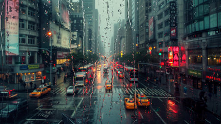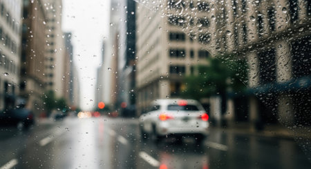 A captivating view of a rainy day traffic scene, showcasing blurred cars and raindrops on a windshield, creating a moody atmosphere in an urban setting.